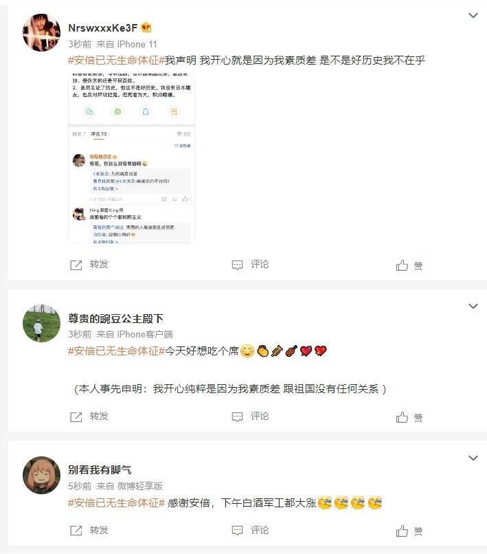 例如,中國一位小粉紅撰文,「是哪一位抗日英雄(指開槍的嫌犯山上徹也)」,署名「草莓爆珠牛奶」的小粉紅,貼圖指「我們就是適當慶祝一下」,更有多名「小粉紅」發文,安倍已無生命跡象,「我開心純粹是因為我素質差,跟祖國沒有任何關係」,另有一位小粉紅拐彎抹角留言,「對一個老人(指安倍晉三)的不幸,冷嘲熱諷的大國人(民),你們的道德在哪裡?底線在哪裡?吃席(指慶祝)的地方又在哪裡!」