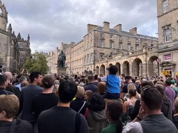 周日女王灵柩抵达爱丁堡之前,大批民众已经聚集在灵柩经过的大道旁等候。