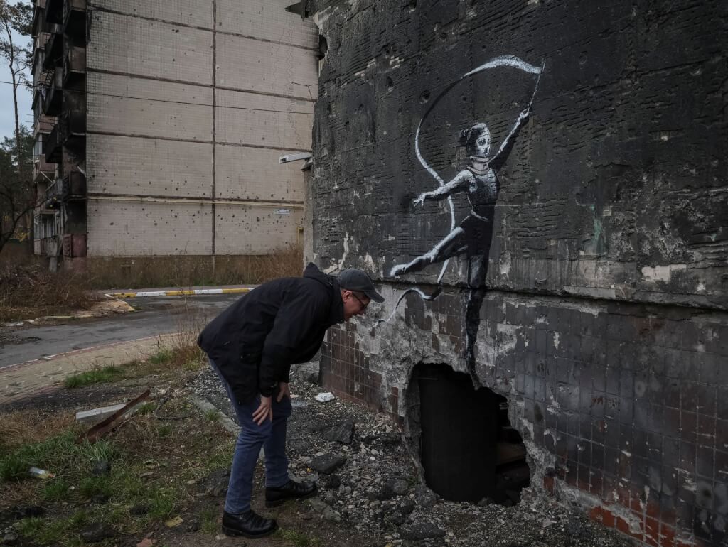 知名英國塗鴉大師班克西(Banksy)在烏克蘭首都外一棟在砲火轟炸下四分五裂的建築物外牆留下一幅作品,烏國民眾盛讚這是國家堅不可摧的象徵。