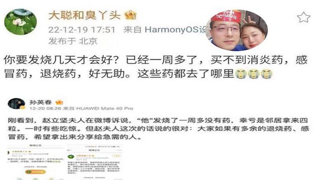 12月19日,疑似中國外交部發言人趙立堅妻子湯天如的微博賬號“大聰和臭丫頭”發佈貼文,抱怨自己在放鬆疫情管控後買不到防疫藥品。