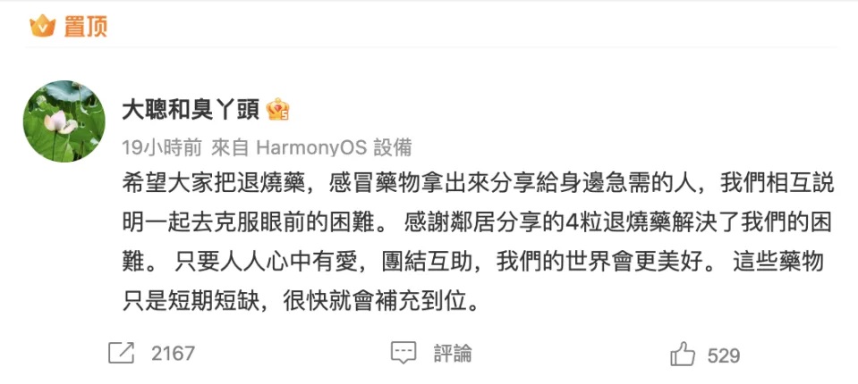 “你要發燒幾天纔會好,已經一週多了,買不到消炎藥、感冒藥、退燒藥,好無助。這些藥都去哪裏?”該賬號寫道。