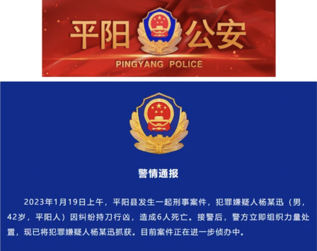 農曆臘月二十八日,浙江省平陽縣公安局週四通報,當天上午發生一起刑事案件,犯罪嫌疑人楊某迅(男,42歲,平陽人)因糾紛持刀行兇,造成6人死亡。警方獲報後,立即組織力量處置,現已將犯罪嫌疑人楊某迅抓獲。目前案件正在進一步偵辦中。