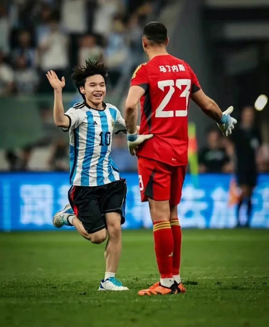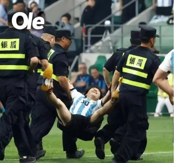 值得一提的是,當晚比賽第66分鍾,出現了一個“小插曲”,一名身穿梅西球衣的狂熱球迷衝入場內,擁抱梅西,全場亂跑,還和大馬丁在內的阿根廷球員擊掌。隨後,多名保安出動將其抬出場外。