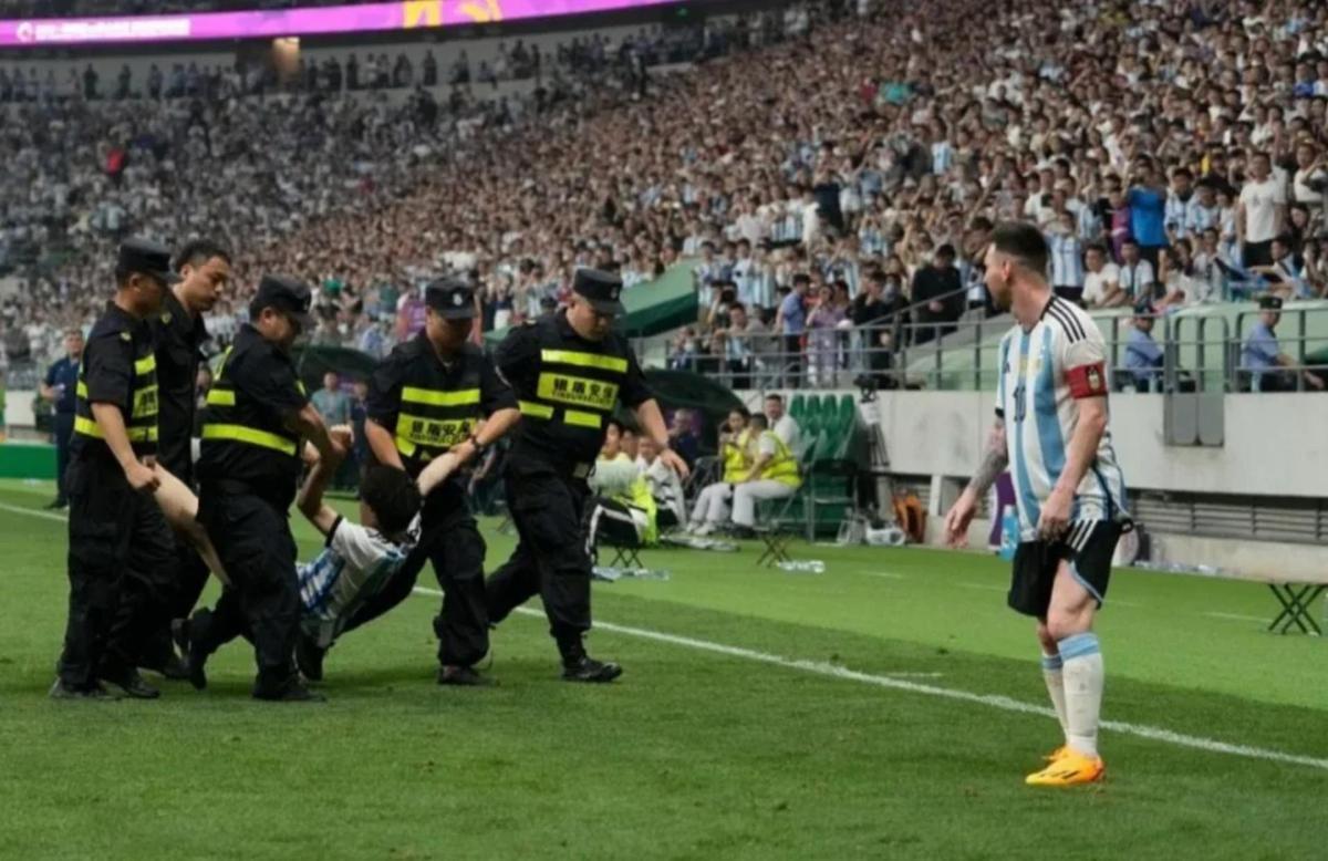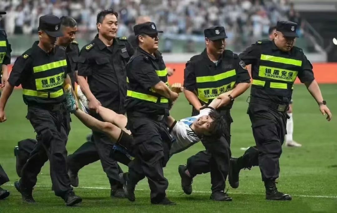 加上轉播顯示,球賽進行到第66分鐘時,身穿梅西10號球衣的邸男從看台欄杆跳下,趁保安不注意衝入場內,在全場球迷的歡呼聲中擁抱梅西。事件導致比賽中斷1分多鐘,邸男隨後被多名保安抬出球場,觀眾高喊「牛逼」歡送他。