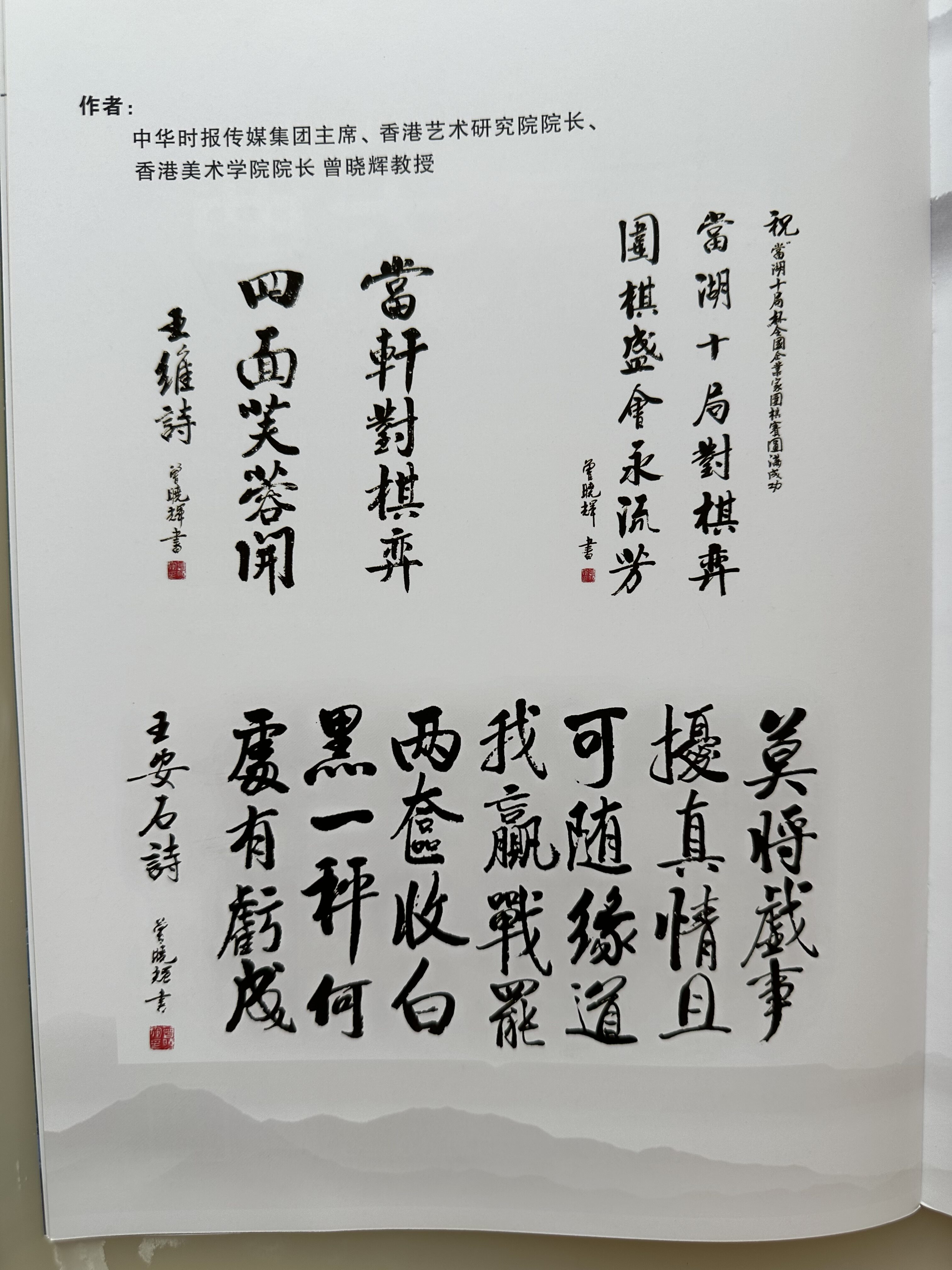 中國「當湖十局」杯第十屆全國企業家團棋賽的舉辦備受矚目。中華時報傳媒集團主席、香港美術學院院長、香港藝術研究院院長曾教授親筆題寫了「當湖十局對棋弈 圍棋盛會永流芳」這幅書法,祝賀該賽事圓滿成功。這幅書法寄託了對這場盛會的美好祝願,也表達了對圍棋的熱愛與推崇。