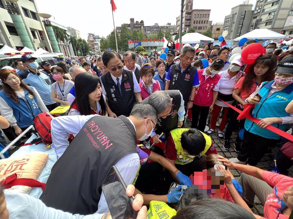 升旗典禮也發生插曲,典禮最後全體大合照時,73歲顏姓婦人突然身體不適昏倒在地,雖然意識清晰仍一度站不起身,救護車開進典禮會場也引發騷動,張善政、醫師出身的副市長王明鉅、衛生局長劉宜廉以及消防局長龔永信都趕赴身旁了解身體狀況,婦人血糖稍低,原本婉拒送醫,在大家堅持下仍赴醫院檢查。