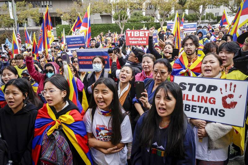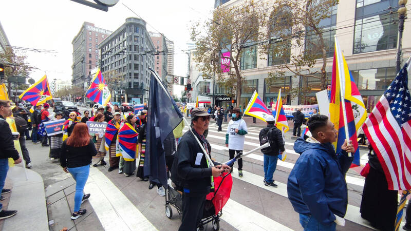 中華新聞通訊社/中華時報11月16日訊)拜習會今天在舊金山舉行,各路抗議風起雲湧,多個抗議團體現身舊金山市區,包含手持「Save Tibet(拯救西藏)」、「Free HongKong(讓香港自由)」標語的團體,現場氣氛十分熱鬧,多元族群同時展現訴求。也有大批舉著中國五星旗的民眾,為習近平搖旗吶喊。