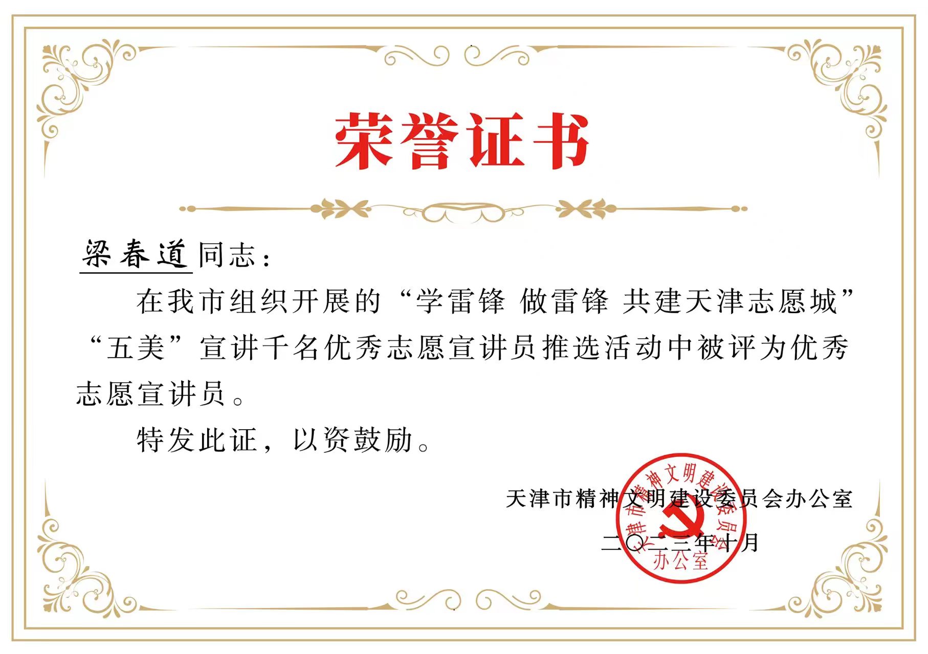 中华时报/中华新闻通讯社(记者 梁永 通讯员 黄焯民 文福华 陈莹 闫贵红)近日,天津市东丽区退役军人事务局老兵宣讲团副团长、市老战士宣讲团成员、区军休所关工委常务副主任梁春道同志,荣获市文明办颁发的“优秀志愿者宣讲员“荣誉证书。梁春道同志,是研究雷锋成长道路的专业老师,在职时,曾参编论雷锋专著6部,发表学雷锋论文10多篇,被湖南省东方名人研究院(雷锋故乡)聘任为特约研究员。近年来,他宣讲雷锋事迹共70多场。曾和全国学雷锋标兵朱伯儒将军、雷锋战友陈广生将军、全国雷锋精神研究会会长曲啸、雷锋团第10任政委张怀先、雷锋连第16任指导员朱华,在一起研究学雷锋课题。他每年宣讲8场上下,2023年3月,在纪念毛泽东同志给雷锋题词“向雷锋同志学习“60周年之际,他连续宣讲13场。