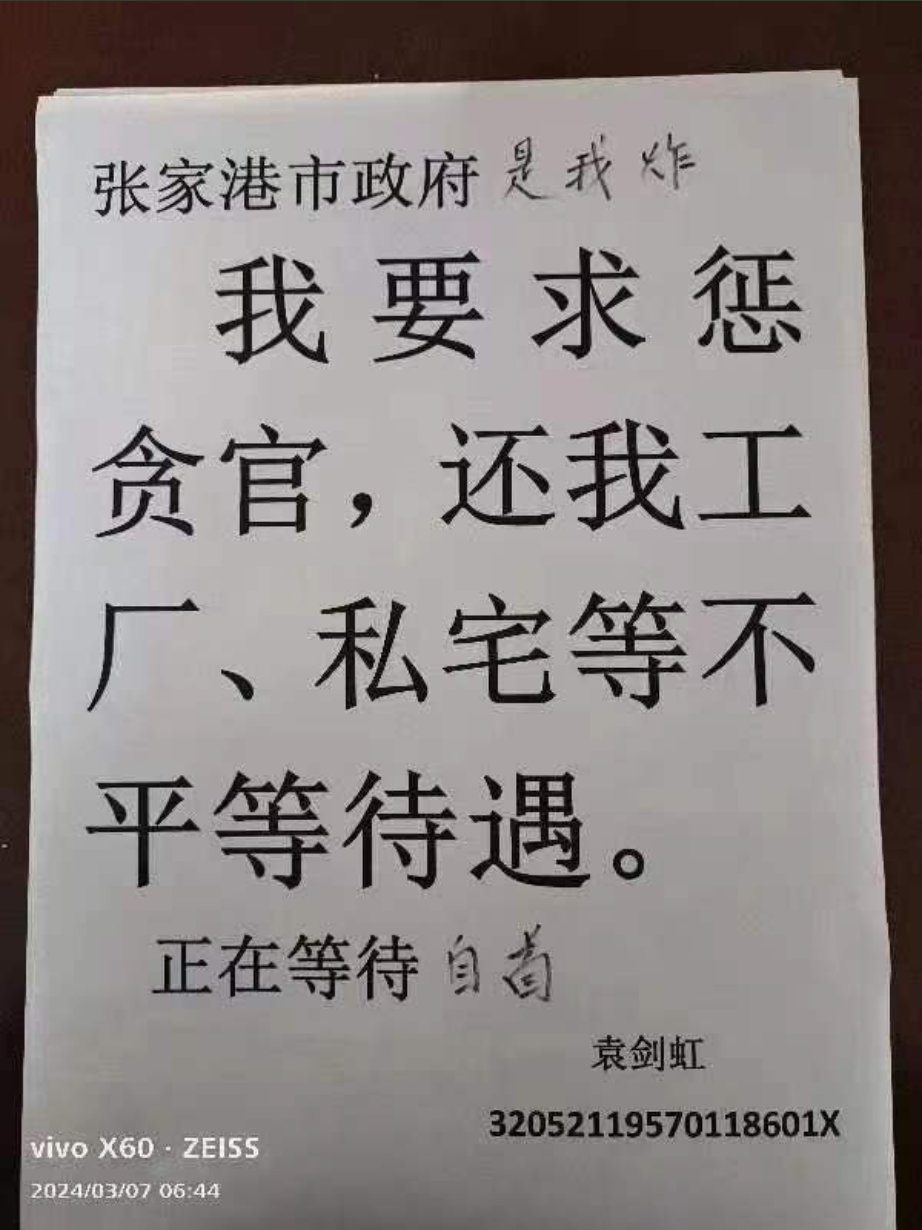一張3月7日早上6時44分署名「袁劍虹」的網路截圖顯示,「張家港市政府是我炸,我要求懲戒貪官,還我工廠,私宅等不平等待遇。正在等待自首」。