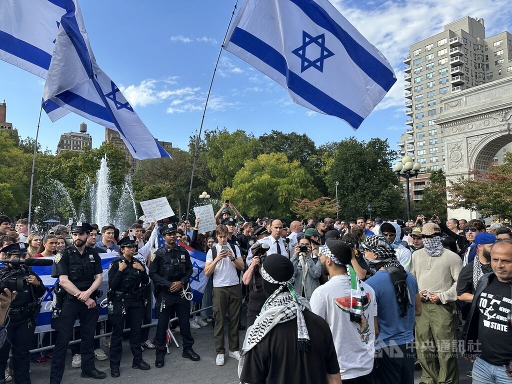 部分遊行人士在華盛頓廣場遭遇揮舞以色列國旗、支持尼坦雅胡政府的人士,警方隔開雙方,兩隊人馬相互叫囂。