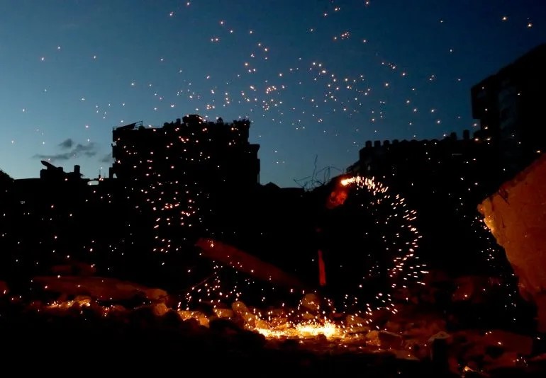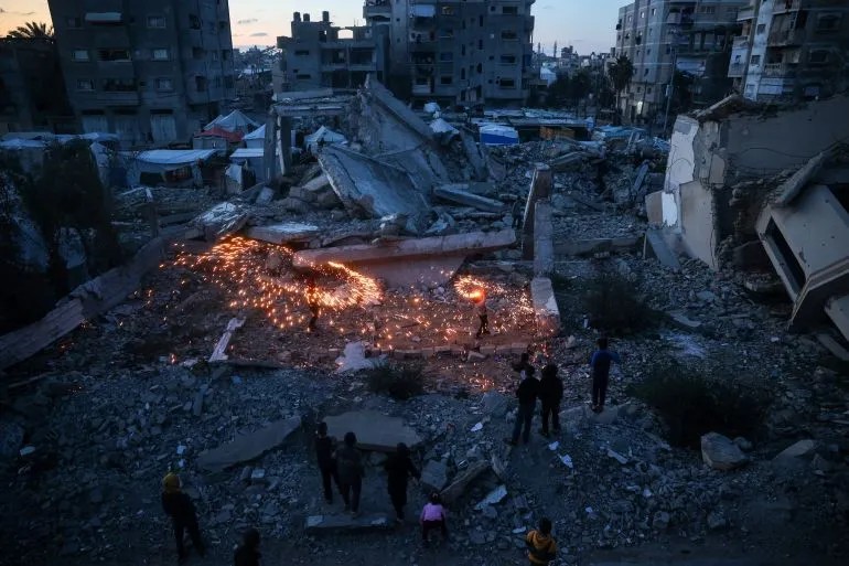 照片:隨著停火的臨近,加沙的巴勒斯坦人點燃煙花棒