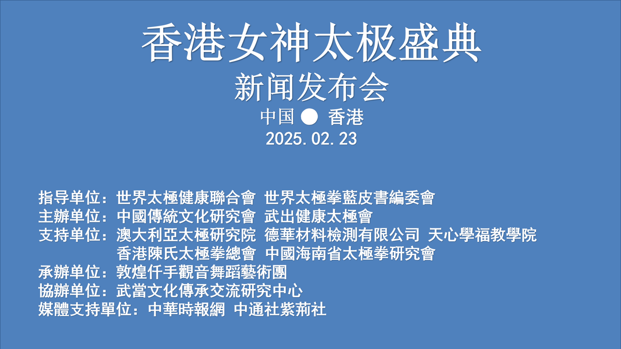 (中華新聞通訊社/中華時報2月24日香港訊) 近日,備受矚目的“香港女神太極盛典”相關消息正式發佈。本次盛典由世界太極健康聯合會、世界太極拳藍皮書編委會擔任指導單位,中國傳統文化研究會、武出健康太極會主辦,香港陳氏太極拳總會、澳大利亞太極研究院、德華材料檢測有限公司、天心學福教學院、中國海南省太極拳研究會支持,敦煌仟手觀音舞蹈藝術團承辦,武當文化傳承交流研究中心協辦,將於2025年3月2日19:00 – 22:00在香港銅鑼灣福蔭道7號(銅鑼灣社區中心三樓)盛大舉行。活動旨在慶祝國際三八婦女節,融合太極文化展示、文藝表演與文化交流,自籌備以來便吸引了社會各界廣泛關注。