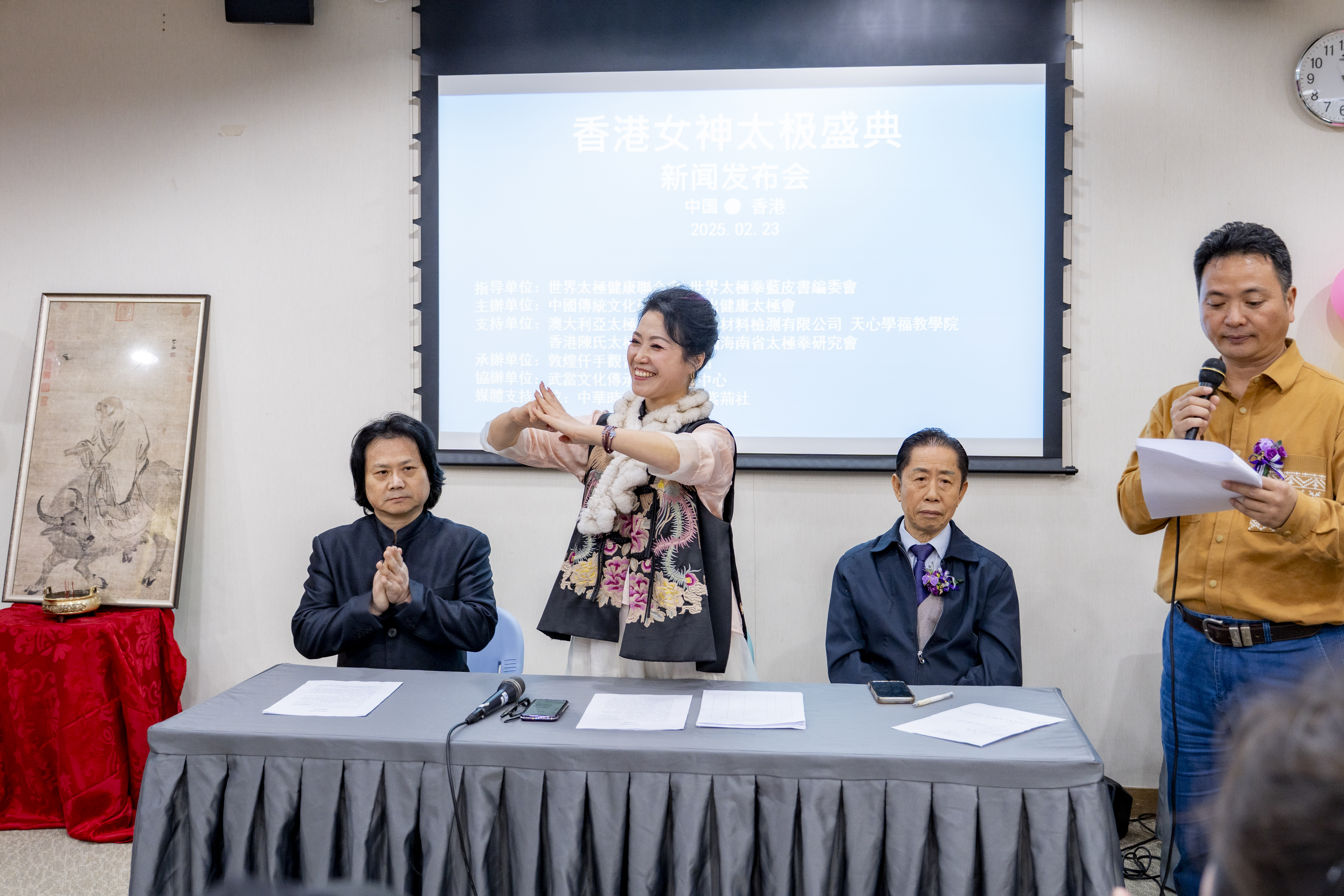 本次盛典亮點突出,特別邀請到世界太極女皇高佳敏女士,以及國際太極女神林秋平、曾衛紅、陳媛媛、林旭、問闞紅等校企名家擔任顧問,為活動注入深厚且專業的太極文化內涵。 2025年2月23日,在香港聯合出版社新聞發佈會上,眾多領導嘉賓出席。世界太極健康聯合會會長、世界太極拳藍皮書編委會專家委員林號營師傅主席並發表講話;中國傳統文化研究會執行會長、武出健康太極會主席廖蘭香老師致辭;香港陳氏太極拳總會主席陳國華師傅、天心學福教學院創辦人劉源山先生共同發表講話。出席新聞發佈會的還有特邀嘉賓番波超教授、C C A港信顧問唯瀚高院長、敦煌仟手觀音舞蹈藝術團團長藍陸英、譚詠梅女士等各界知名人士,他們共同見證了此次盛典新聞發佈。 發佈會上,記者提問環節備受關注。中華時報網記者Harrison向指導單位林號營院長提問:“人們怎麼理解太極和太極拳?”林號營院長回答:從哲學角度看,太極是陰陽和諧、相互轉化的思想,代表萬物本原和規律;在文化領域,它貫穿中醫、武術等,是傳統文化核心概念和文化認同符號;從宇宙觀來說,太極被視為宇宙初始混沌態,演化出萬物。而太極拳,從武術角度,是傳統武術流派,動作舒緩,以柔克剛用於技擊;健身方面,能調節呼吸、活動關節、促進氣血循環;心理層面,可培養專注力,讓人平靜安寧;文化層面,承載傳統文化,是中外文化交流窗口。 中通社記者洪少葵提問:“舉辦‘香港女神太極盛典’公益活動是每年都要舉辦嗎?”主辦方廖蘭香主席回應:舉辦“香港女神太極盛典”主要是推廣太極文化和太極拳對人體健康運動的益處,讓更多人瞭解其內涵;促進大家身心健康,改善身體和心理狀態;助力公益事業,籌集善款幫助他人;增強文化交流與認同,讓香港和外界增進對中華文化的認識。今年是首次舉辦,存在很多不足之處,若2026年國際三八婦女節前條件允許,會考慮繼續舉辦,為女士朋友們及香港社會多元文化貢獻力量。 香港陳氏太極拳總會主席陳國華師傅在回答“香港太極拳產業當前是否有新的更好的發展方向”這一問題時表示,香港太極拳正在從傳統的辦學樣式轉向與香道、茶道融合的發展道路,未來可能會在更多領域融合發展。 承辦方發佈了“香港女神太極盛典”籌備的基本情況和3月2日盛典活動現場的具體內容。盛典將呈現豐富多彩的文藝節目,包括精彩絕倫的太極表演,搭配動聽的歌曲、優美的舞蹈以及震撼人心的千手觀音表演,全方位展現女性的堅韌與優雅,深度詮釋太極文化的博大精深,讓觀眾沉浸在太極文化的獨特魅力之中。