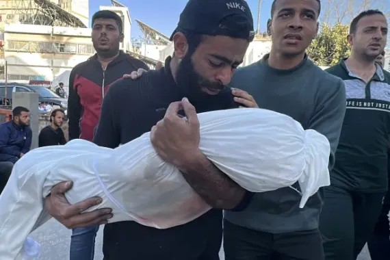 在加薩中部馬加齊難民營被殺害的一名巴勒斯坦人的屍體被轉移到阿克薩烈士醫院[位於代爾巴拉赫]。