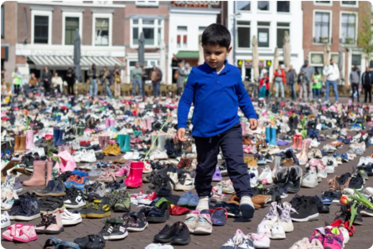 週日,數千名兒童鞋在荷蘭萊頓的布雷斯特拉特廣場進行象徵性抗議,旨在引起公眾對以色列襲擊造成的破壞性損失的關注。