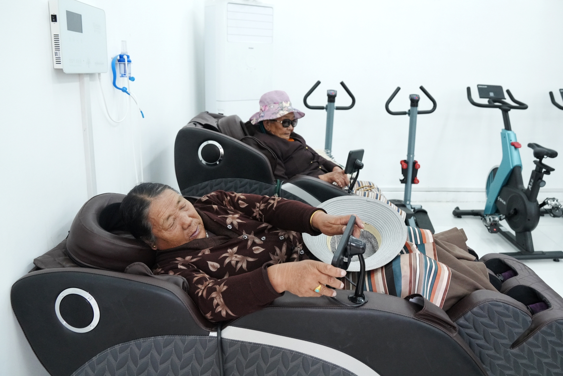 在活動室,78歲的白瑪躺在按摩椅中享受按摩服務。她告訴記者,兒子平日在外上班,她的一日三餐都在驛站。娛樂休閑之餘,她對按摩椅很感興趣,每天都用1個小時疏通筋骨。和記者交流時一次按摩結束,白瑪熟練地在操作屏上再次按下啟動按鈕。
