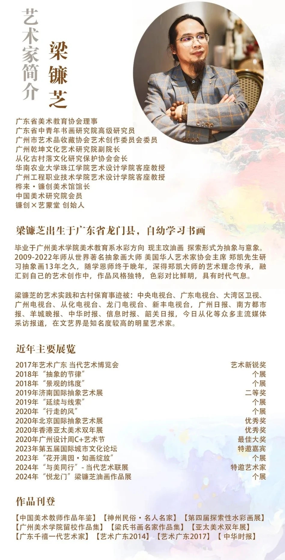 作為知名職業藝術家,梁鐮芝師從世界著名抽象畫大師、美國華人藝術家協會主席鄭凱研習抽象畫,他在抽象繪畫上不斷追求、探索,堅持創作,不斷突破自我瓶頸,探索出自己的繪畫風格。他認為繪畫是畫家的自我表達,其目前創作分為五個系列:景觀系列、格子系列、花卉系列、墨韻系列、調性研究。其中,景觀系列、格子系列貫穿時長有近十五年的探索。作品通過架上繪畫的表現形式,藉以繪畫媒材的綜合使用,尋找一種新的、有別於平常視覺的物象還原,在色彩、造型、色調、意境、繪畫狀態等因素的作用下引入詩意的表達。