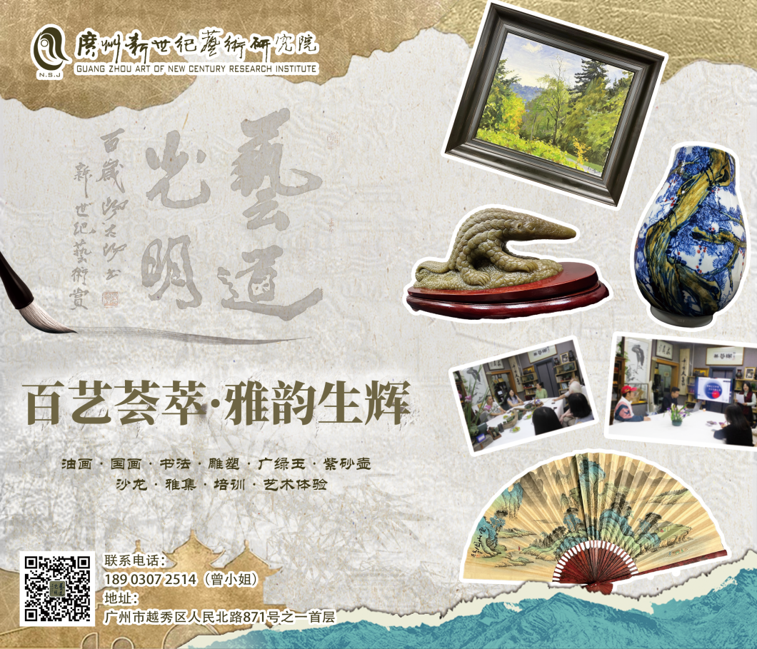 在藝術領域上,廣州新世紀藝術研究院是美術家、收藏家、書法家、攝影家,民間藝術家展示、交流、交易的勝地,由成立於2003年的廣州新世紀書畫研究院改制而來,由曾曉輝博士創辦,設有藝術館、培訓學校,以及書畫、工藝、文物、文學和音樂等多個研究所,是集研究、收藏、銷售、培訓、教育、演藝、出版、展覽和拍賣於一體的法人機構,致力於全方位多元發展,為公眾提供多元藝術體驗,促進藝術與文化的交流與融合。