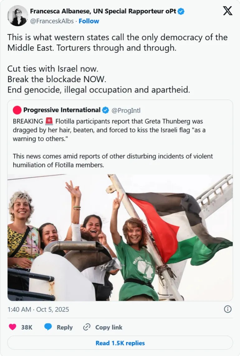 • 歐洲多國周末有數十萬人上街,抗議以色列攔截試圖向加沙運送援助物資的國際救援船隊並扣查船上人員,要求釋放他們及立即結束加沙戰事。其中意大利羅馬連續四日有民眾示威,主辦單位說有超過100萬人參與,警方則說有25萬人。有人懷疑向警員投擲酒樽,有示威者被制服。