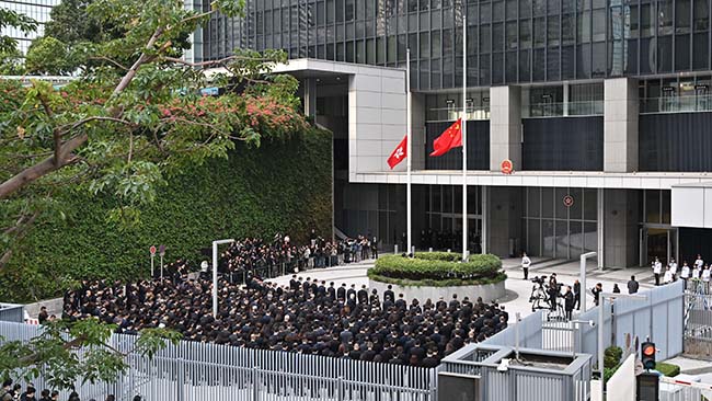 上午八時,行政長官李家超聯同主要官員、行政會議非官守議員及公務員在政府總部東翼前地默哀三分鐘,沉痛哀悼在大埔宏福苑火災不幸罹難的人士。