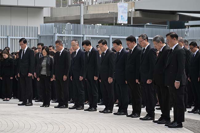 行政長官李家超聯同主要官員、行政會議非官守議員及公務員,今日(十一月二十九日)在政府總部東翼前地默哀三分鐘,沉痛哀悼在大埔宏福苑火災不幸罹難的人士。