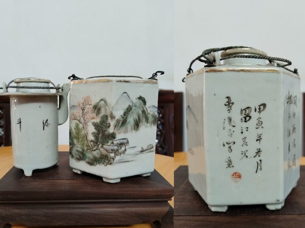 民國三年(1914年)李浚茂造淺絳彩山水詩文執壺,是我收藏中的心頭好。壺身一側繪江岸遠山之景,亭臺錯落,扁舟淩波,筆墨疏淡空靈,盡得淺絳山水之妙;另一側以俊秀的書法題詠詩文,畫、書、印三者佈局和諧,渾然一體,精准詮釋了“瓷上文人畫”的藝術精髓。每每凝視此壺,仿佛能穿越百年時光,觸摸到清末民初文人寄情山林、避世修身的精神追求。