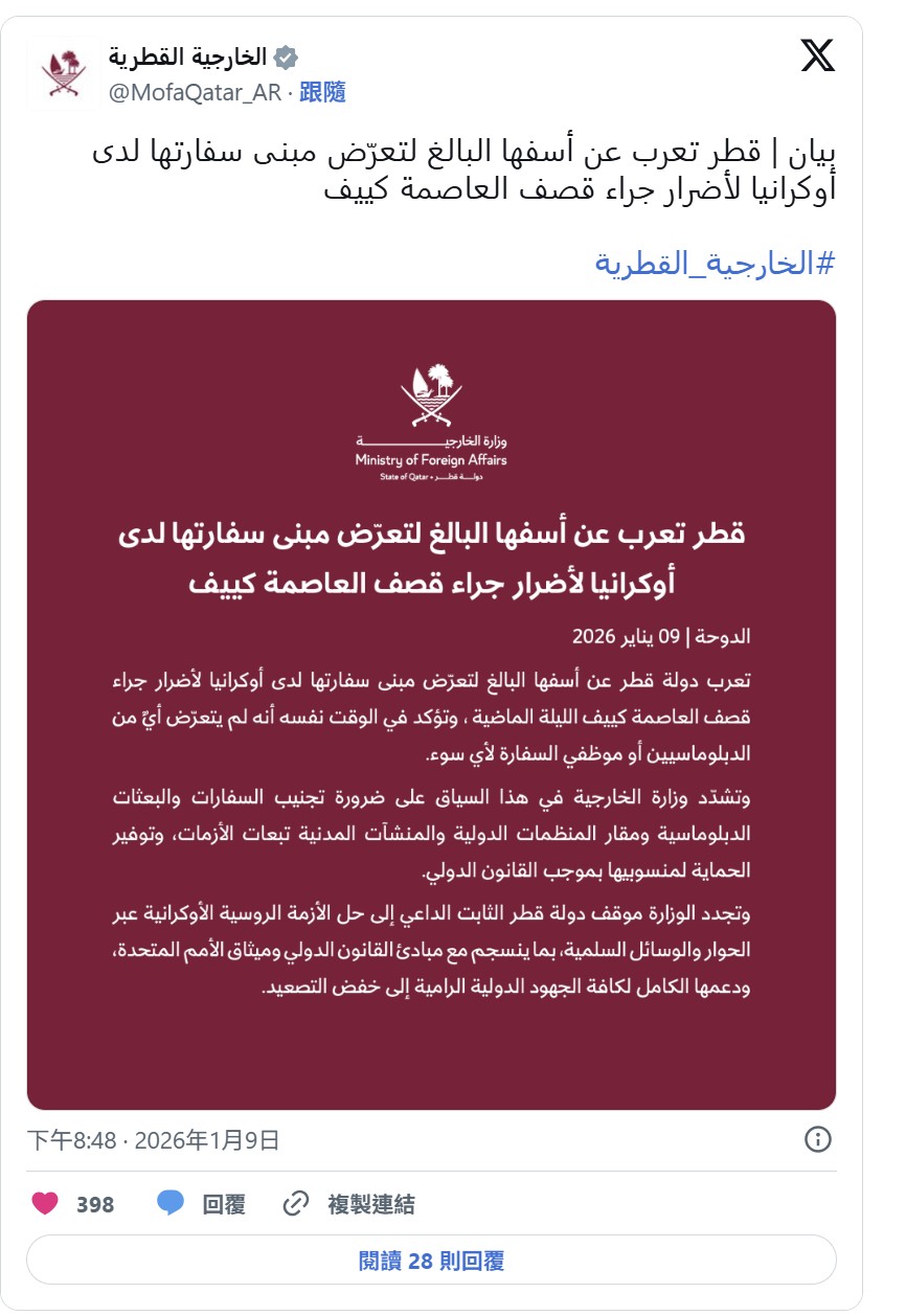 卡達國對昨晚基輔首都遭到砲擊,導致駐烏克蘭大使館大樓受損深表遺憾,同時確認沒有外交官或使館工作人員受傷。