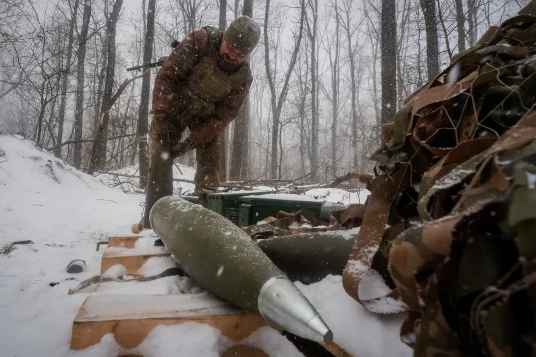 一名烏克蘭士兵在哈爾科夫地區前線向俄軍陣地發射砲彈前,正在準備砲彈。.webp)