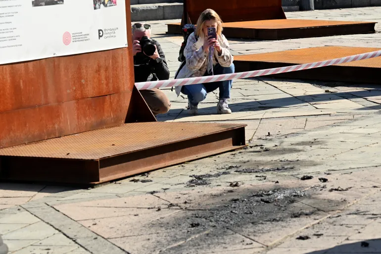 2026年3月16日,在俄羅斯入侵烏克蘭期間,記者在基輔獨立廣場拍攝被擊落的俄羅斯無人機殘骸墜落地點的照片。