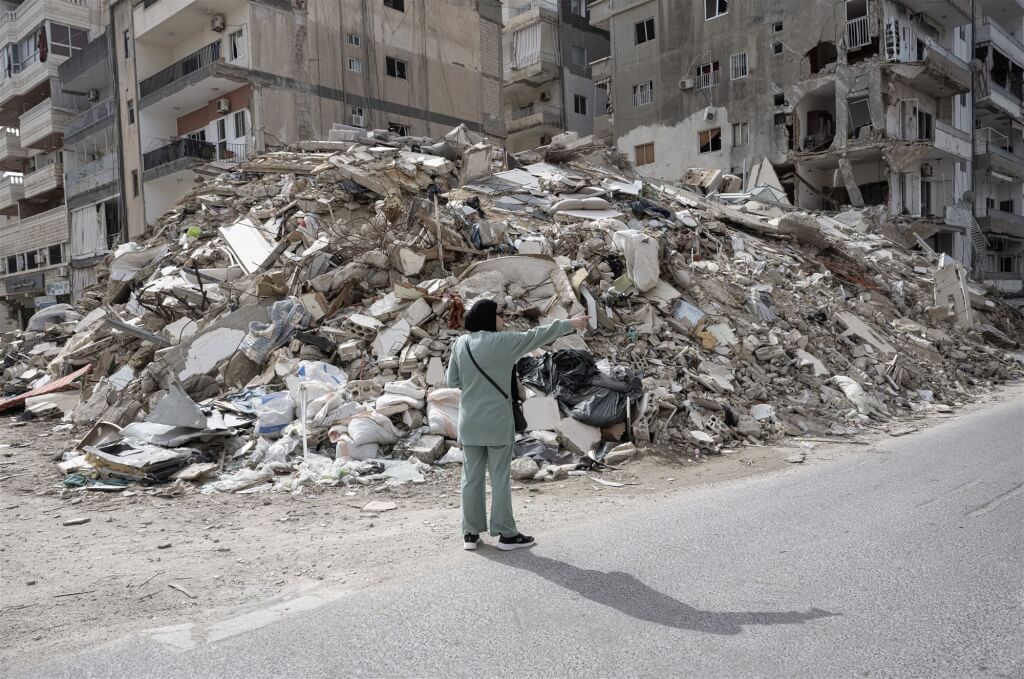 黎巴嫩南部城市泰爾的民眾19日站在被以色列摧毀的建築旁。(安納杜魯新聞社)