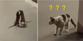 两只老鼠站立互殴 猫咪被吓傻丨趣观世界