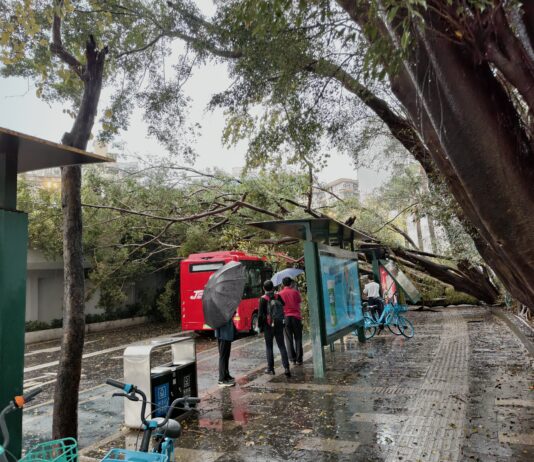 突發:廣州流花湖公交站大樹倒伏壓中公車,站牌受損,...
