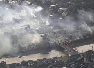 石川縣輪島市大量建築被燒毀,今早仍冒出大量白煙。(...