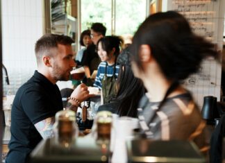 在貴陽喬治隊長咖啡館吧台前,來自法國的沃爾夫岡(Wolfgang)看著咖啡師把霧化後的...