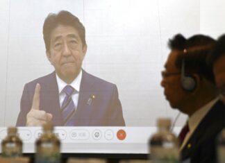 安倍昨日向台灣一個論壇發表視像演說。(美聯社)