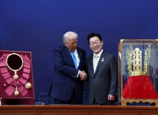 韓國總統李在明今天在韓國慶州市與美國總統川普舉行峰...