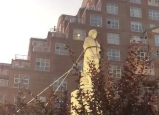 美國一座哥倫布雕像被示威者推倒推落河灣