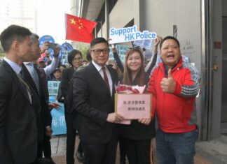 邓炳强出席中西区区议会 支持及反对警方人士场外对骂